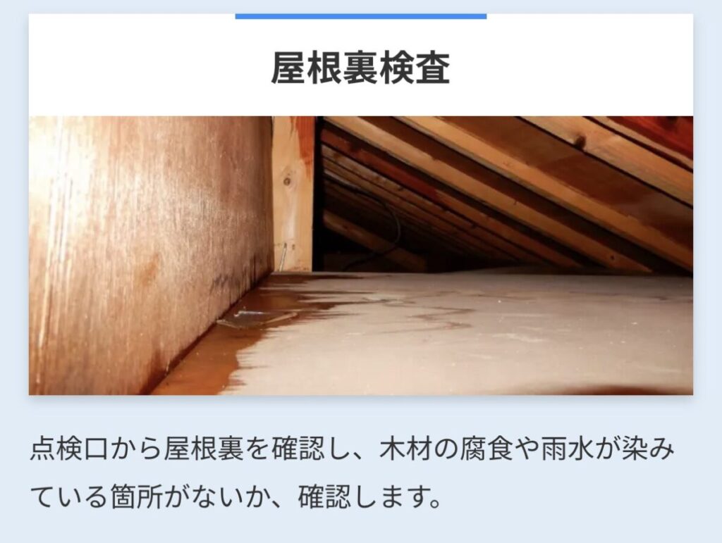 点検口から屋根裏に直接入り、木材の腐食や雨染みを直接確認。