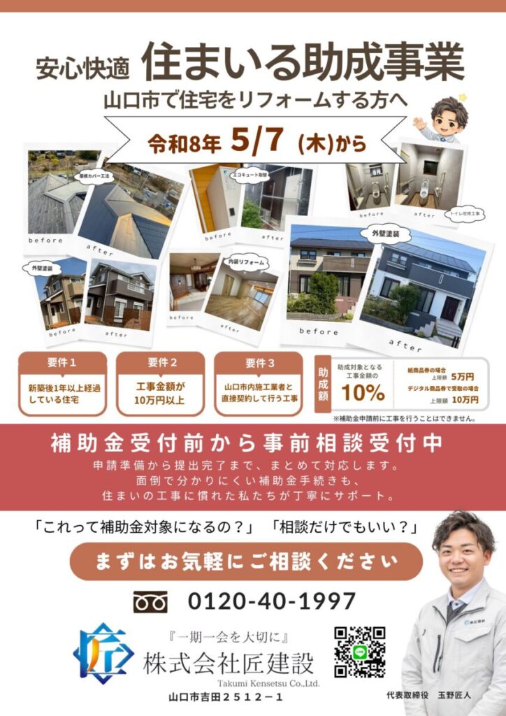 こんにちは、山口市の匠建設です!物価高騰が続く中、「家の修繕をしたいけれど、もう少し先でいいかな…」と迷われている方に朗報です。山口市が実施する「やまぐちプレミアム付商品券」の予約受付がいよいよ始まります!なんと今回、匠建設はこの商品券の... -
